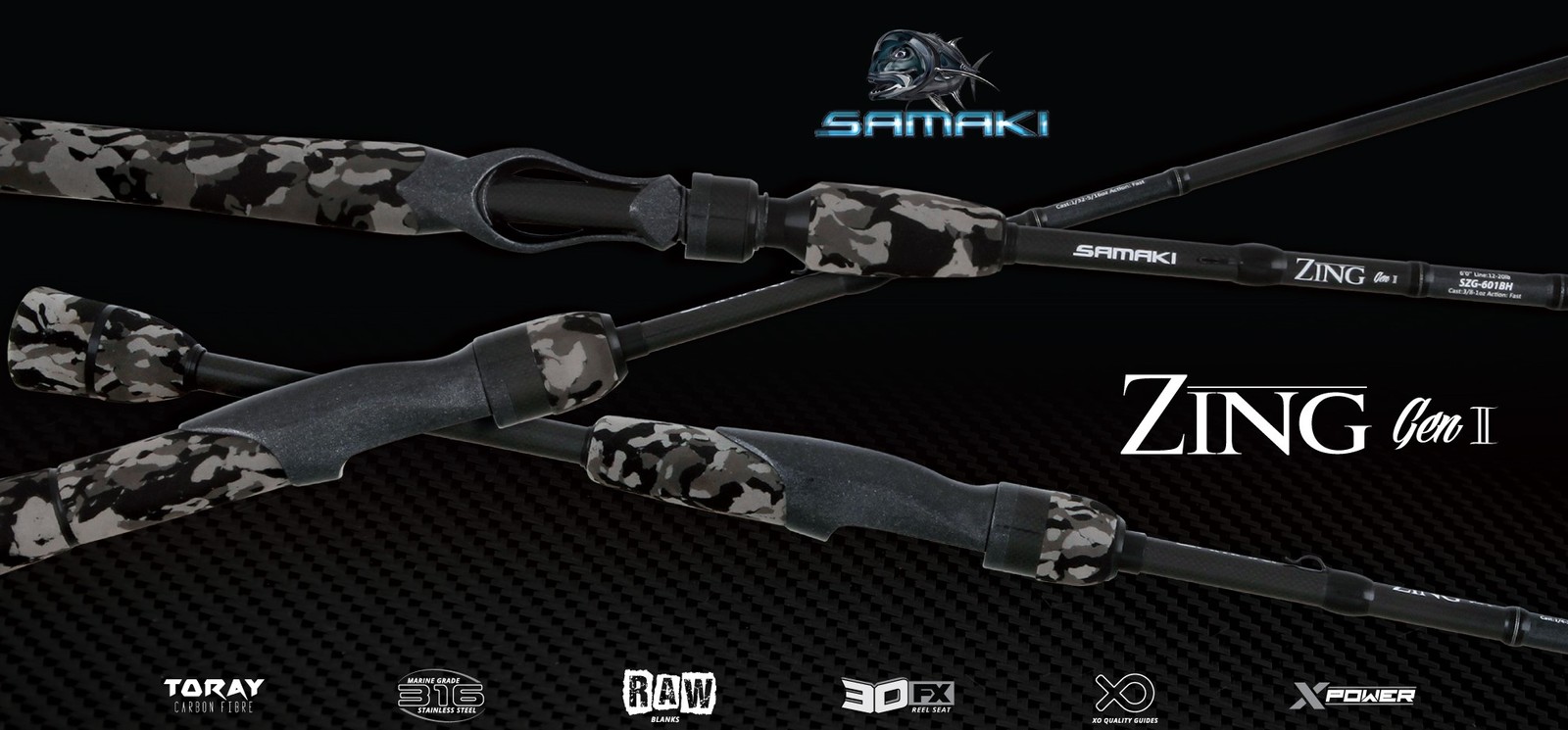 Cutting-edge design and advanced technology are at the heart of the next generation of Samaki Zing. Premium, high quality Japanese Toray carbon fiber blanks with X-power construction and unique unsanded RAW finish are lighter, stronger and more rigid then ever.